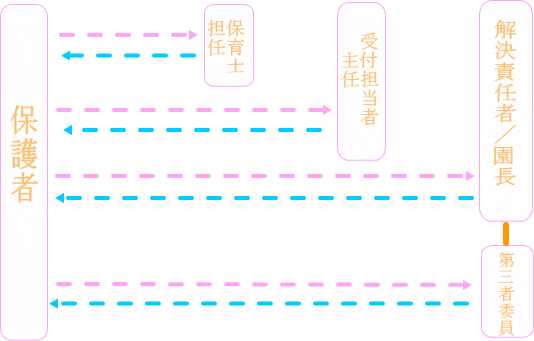 ご意見・ご相談・ご要望等を随時受け付けておりますので、何かございましたらその都度ご相談ください。また、保護者の立場や状況に配慮した適切な対応を図る為に、第三者委員に直接相談できる仕組みを設置しておりますので、重要事項説明書をご覧ください。